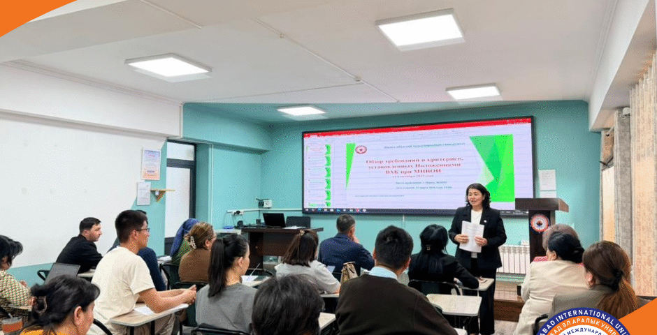 March 31, 2026On March 31, 2026, a seminar entitled “Review of the Requirements and Criteria Established by the HAC Regulations” was held at Jalal-Abad International University with the participation of the entire academic staff of JAIU. The speaker at the seminar was Zulfiya Atamyrzaevna Asilova, Vice-Rector for Science, State Language, and Social Affairs.