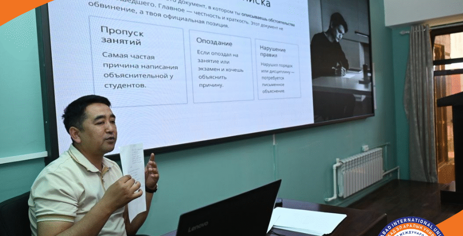 2 апреля, 2026В Жалал-Абадском международном университете для студенов 1-го курса был проведён семинар на тему “Правильное оформление официальных документов”. Мероприятие провёл декан факультета Астанов Шавкатбек Моминжанович.